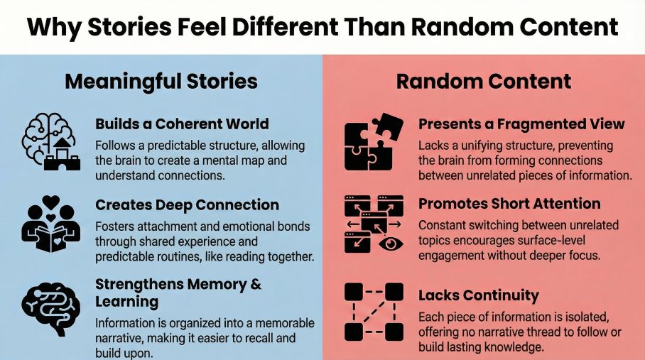 विकासात्मक मनोविज्ञान के दृष्टिकोण से, यह केवल मनोरंजन संबंधी प्राथमिकताओं का मामला नहीं है। यह इस बारे में है कि विकासशील मस्तिष्क अर्थ, पहचान और भावनात्मक सुरक्षा का निर्माण कैसे करता है। शोध से हमें पता चलता है कि सार्थक कहानियाँ बच्चों पर यादृच्छिक सामग्री की तुलना में इतना गहरा प्रभाव क्यों डालती हैं।.