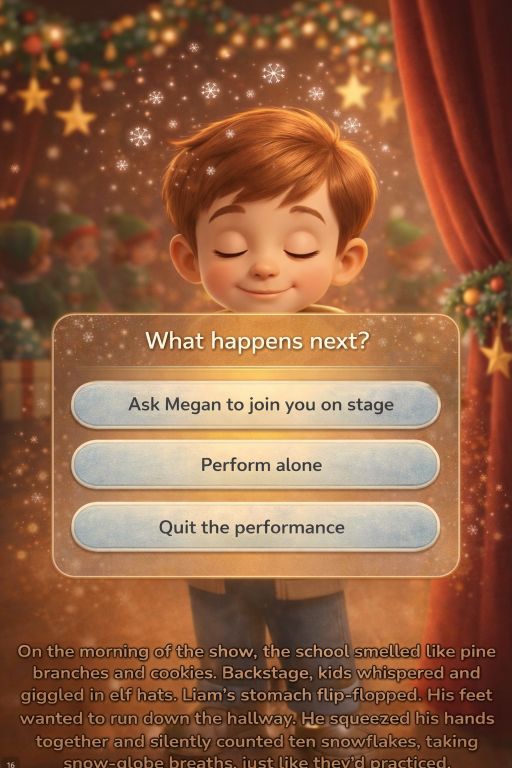 choose what happens next (two or three kid-friendly options, or a parent prompt)